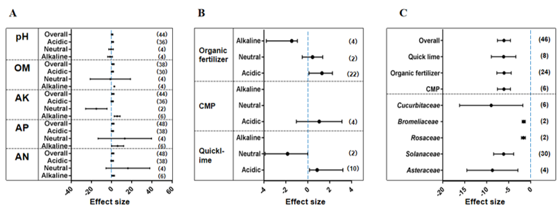 = -0.34,p< 0.001; lnRR = -0.54,p< 0.001;图1A)。过量的有机质(≥ 30 g kg-1)和AN (≤60 mg kg-1; ≥ 150 mg kg-1)会显著加剧病害的发生(lnRR = 0.26,p< 0.001;