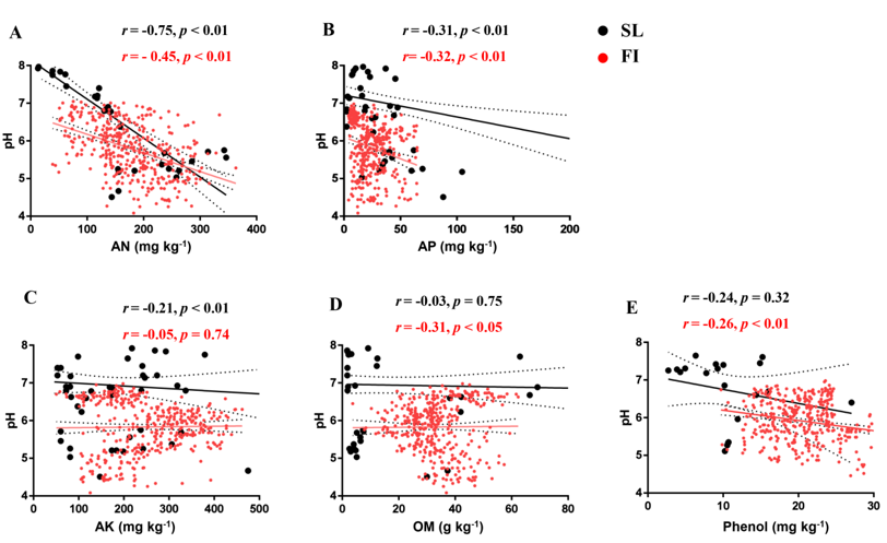 图2土壤pH值与AN(A)、AP(B)、AK(C)、OM(D)和酚类(E)之间的线性关系。AN、AP、AK、OM、FI和SL分别代表碱解氮、有效磷、速效钾、有机质、田间调查和选定文献。