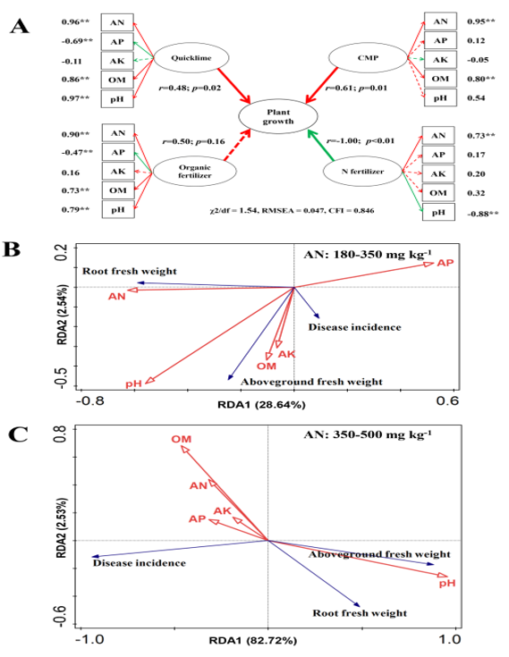 采用结构方程模型进一步分析土壤改良对三七生长的影响,结果清楚地表明生石灰(r= 0.48p< 0.05)、钙镁磷肥(r= 0.61p< 0.05)和有机肥(r= 0.50p= 0.16)对植物生长有积极影响,但氮肥的不合理施用对植物生长有显著的负面影响(r= -1.00;p< 0.01)(图6A)。土壤改良后碱解氮的含量为180-350 mg kg-1,土壤pH值为5.90-6.16,三七根腐病的发病率碱解氮(图6B)呈显著负相关;相反,氮肥处理后,土壤中碱解氮的含量为350-500mg kg-1,三七根腐病的发病率与碱解氮呈显著正相关(图6C)。由此可知,氮肥不足和过度使用氮肥均不利于作物健康生长,采用适当的土壤改良剂改善土壤pH值高于5.90,土壤AN在180-350 mg kg-1范围内可有效保持三七的健康。