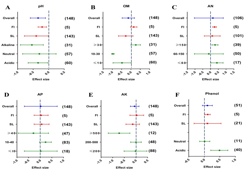 图1土壤pH(A)、OM(B)、AN(C)、AP(D)、AK(E)和酚类物质(F)对土传病害发生的影响。AN、AP、AK、OM、FI和SL分别代表碱解氮、有效磷、速效钾、有机质、田间调查和选定文献。括号中的数字表示用于meta分析的观察数。误差条代表95%的置信区间。虚线表示效果值=0。效应值大于0和小于0分别表明化学因素可加剧和抑制病害的发生。