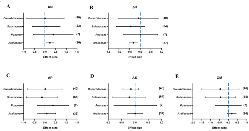 此外,我们根据植物分类的不同进行亚组分析,结果发现,随着土壤AN含量的增加和土壤pH值的降低,五加科植物土传病害的发生(lnRR = 0.23,p< 0.01; lnRR